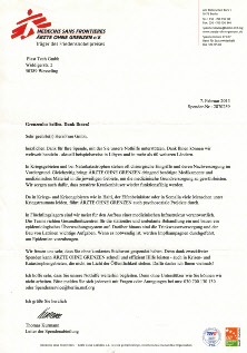 Im Rahmen unserer Möglichkeiten unterstützen wir seit Jahren regelmässig die Hilfsorganisation „Ärzte ohne Grenzen“.